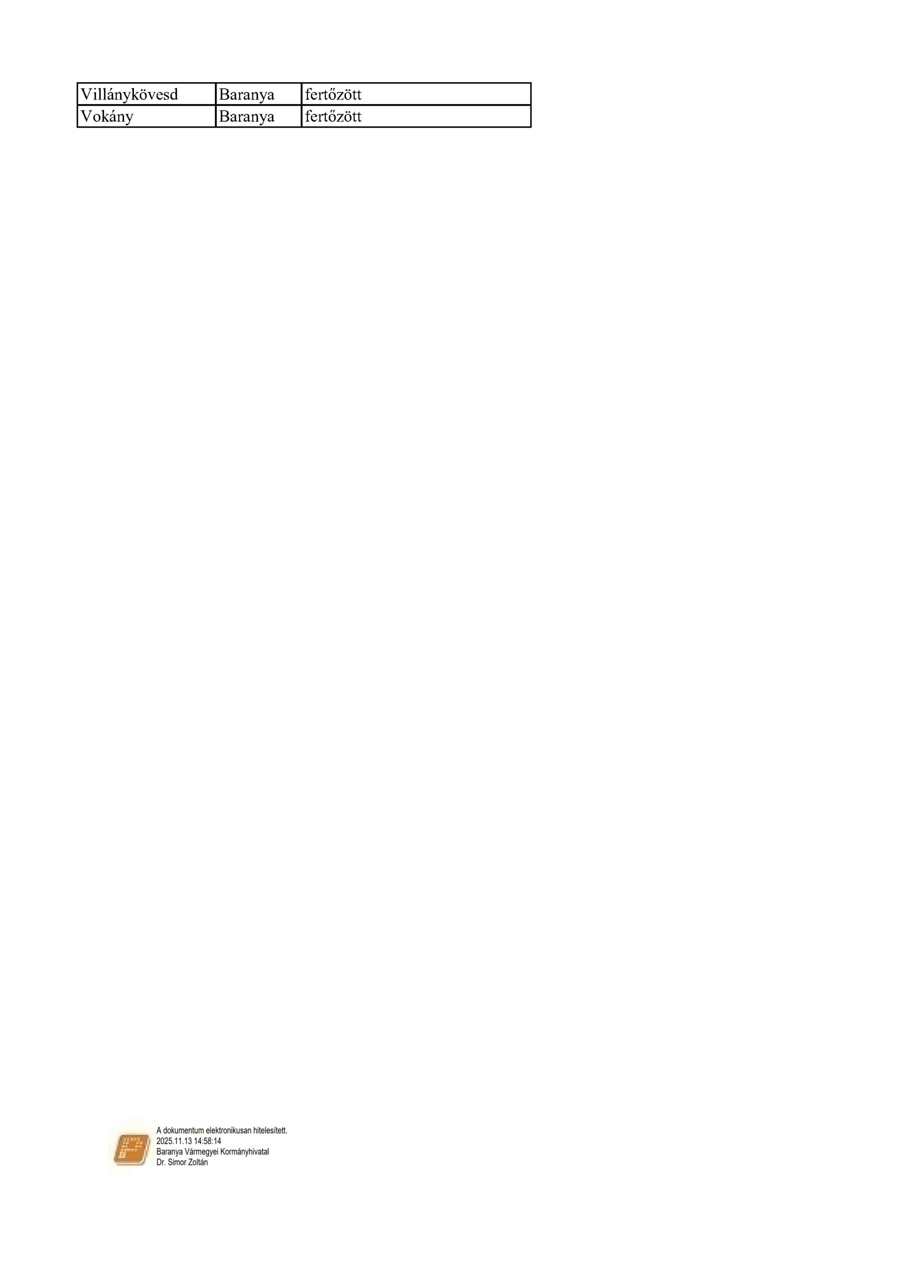 A Baranya Vármegyei Kormányhivatal Élelmiszerlánc-biztonsági és Állategészségügyi Főosztály Élelmiszerlánc-biztonsági és Állategészségügyi Osztály BA/73/00927-36/2025. iktatószámú, „Afrikai sertéspestis betegség vaddisznóban megállapított jelenléte miatt kijelölt fertőzött, és szigorúan korlátozott területre vonatkozó szabályok elrendelése betartásáról kislétszámú házisertés állományok esetében” tárgyú határozatát megküldte azon Közös Önkormányzati Hivatal jegyzőinek, melyekhez az érintett települések tartoznak.