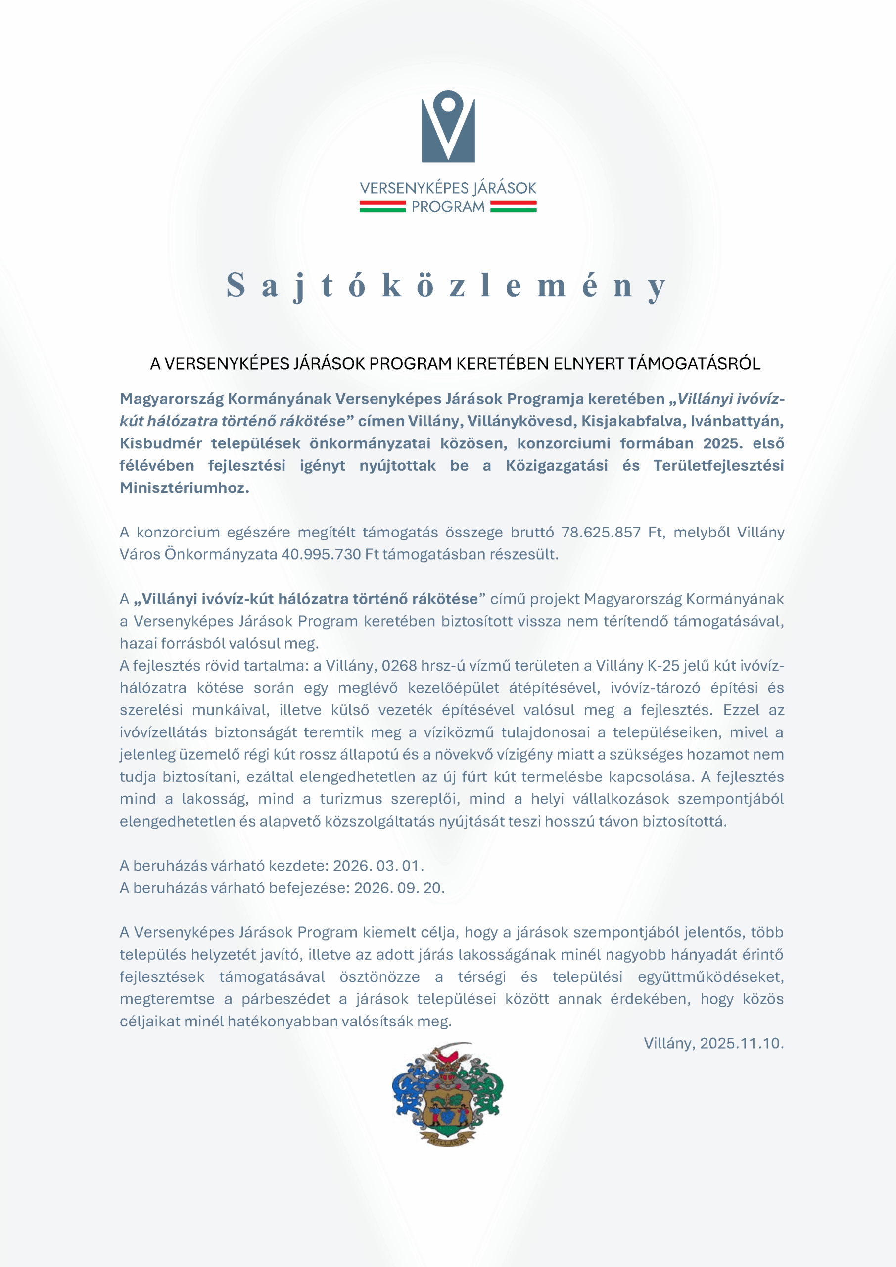 A „Villányi ivóvíz-kút hálózatra történő rákötése” megvalósul Magyarország Kormányának a Versenyképes Járások Program keretében biztosított 78.625.857 forint összegű támogatásával.