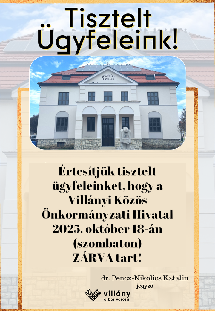 Villányi Közös Önkormányzati Hivatal 2025. október 18-án zárva tart